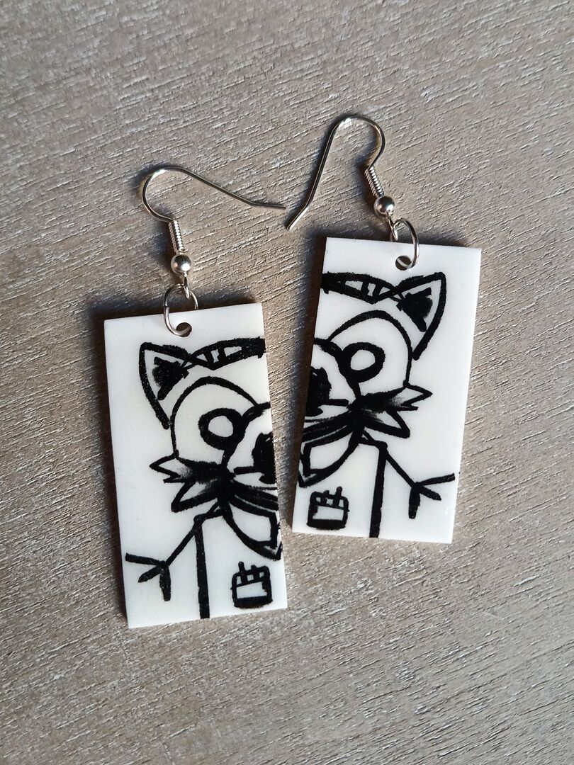 Boucles d’oreilles originales en plastique fou résiné avec un dessin unique de petit weirdo réalisé au fusain