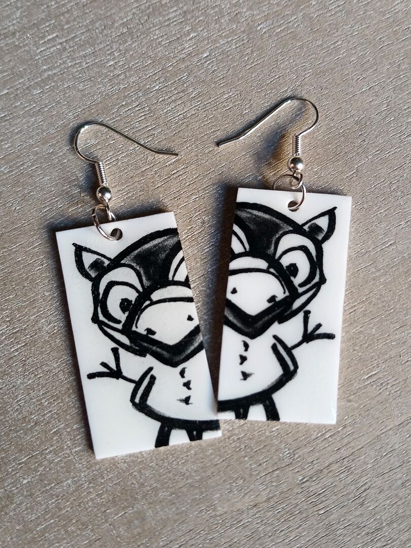 Boucles d’oreilles originales en plastique fou résiné avec un dessin unique de petit weirdo réalisé au fusain