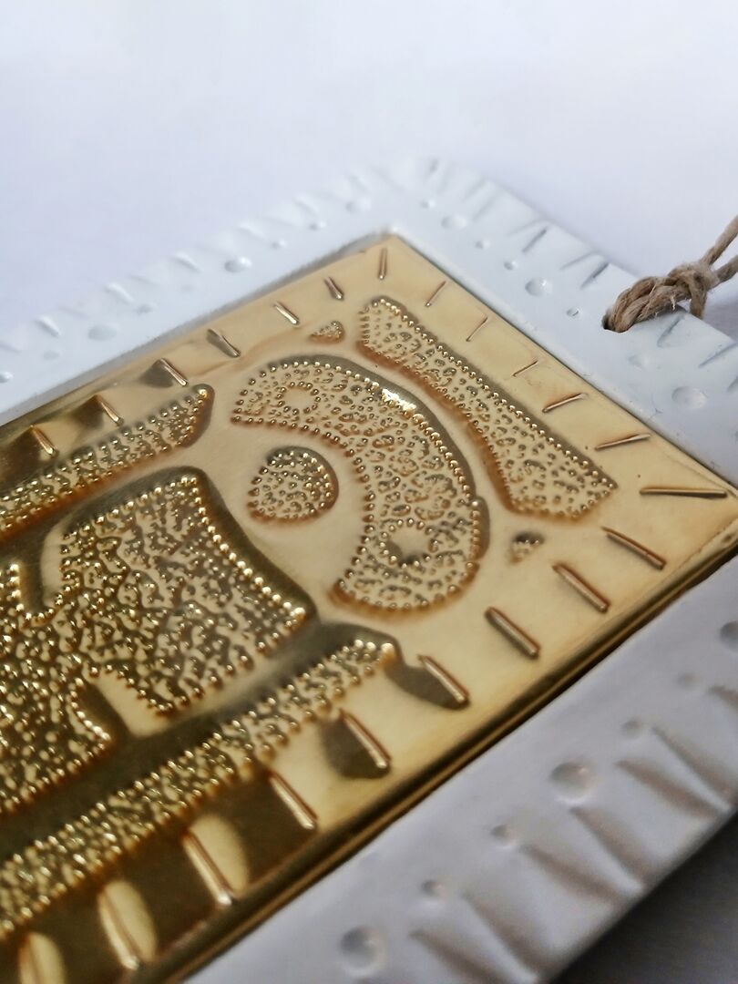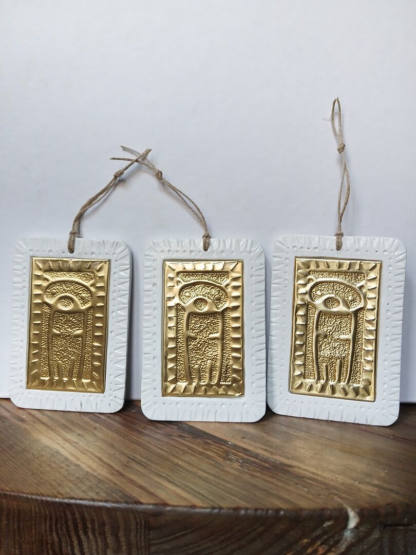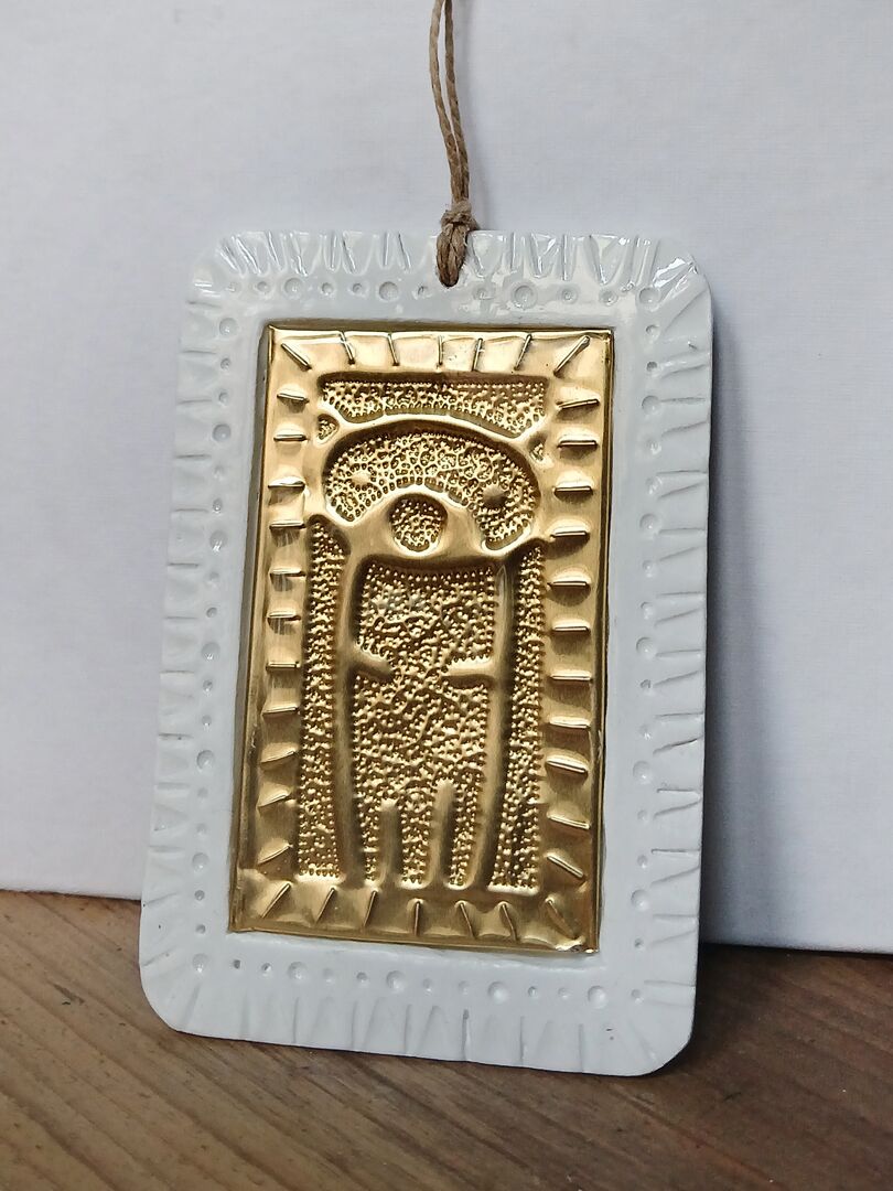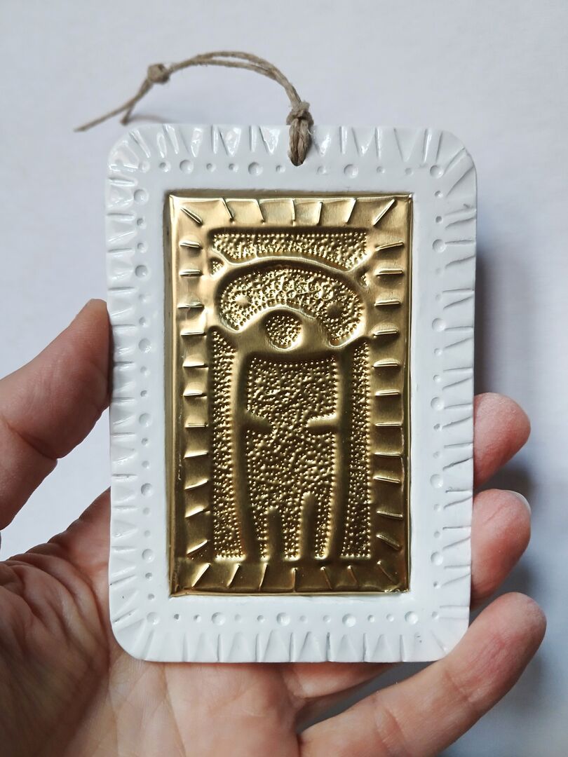 Loutre en métal repoussé doré, incrustée dans un cadre en argile fait main et peint, le tout résiné